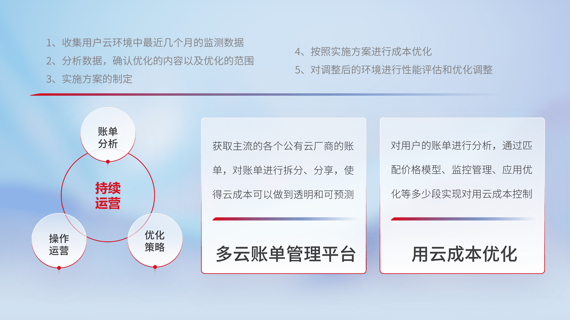 通过多云纳管,,,以统一的资源数据模型把客户的云资源进行抽象和封装,,,进而实现对多云资源的统一操作,,保障云资源管理的可靠性、、稳定性与可用性。。。量身定制化运维内容,,配置、、开发运维、、、补丁管理、、备份、、、、监控、、认证和访问管理、、审计和日常巡检等,,,,保障在用云过程中的可靠度,,稳定度以及高可用率。。。